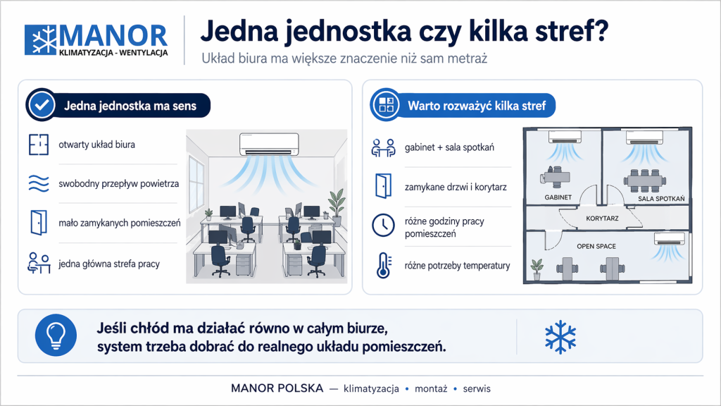 Nie wybieraj klimatyzatora tylko po nazwie modelu albo po cenie z internetu. Najpierw trzeba ustalić, czy urządzenie ma chłodzić jeden pokój, salon z aneksem, kilka połączonych pomieszczeń, biuro open space czy lokal usługowy z ciągle otwieranymi drzwiami. To zmienia dobór mocy, miejsce montażu i sens całej instalacji.