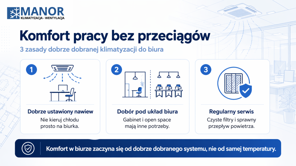 Klimatyzator nie powinien dmuchać prosto na łóżko, kanapę, biurko, recepcję ani miejsce, w którym ktoś siedzi kilka godzin dziennie. To jeden z najprostszych błędów przy montażu. Urządzenie chłodzi, ale użytkownik zaczyna je wyłączać, podnosić temperaturę albo przestawiać żaluzje, bo zimne powietrze leci dokładnie tam, gdzie nie powinno.